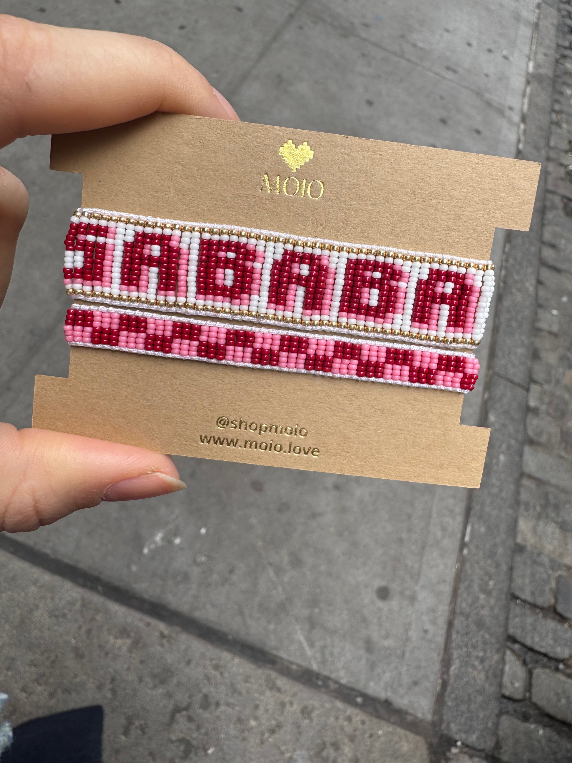 The Sababa Foods x Moio Bracelet Stack pairs our signature “Sababa” Wear Your Word Bracelet with the bold checkerboard design—both handcrafted in Sababa Foods’ vibrant brand colors and brought to life by the artisan team at Moio.